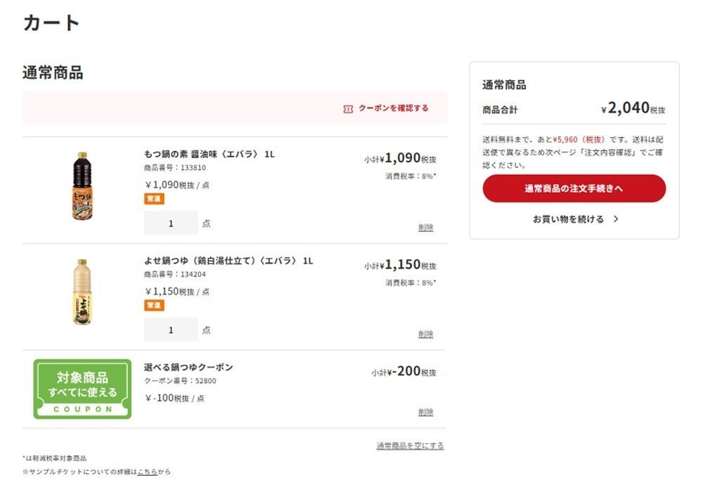 ※クーポン使用時に商品が特定されている場合は対象商品の消費税率を、それ以外の場合は消費税率8%を適用します。ただし、クーポンの値引き額より消費税率8%のご注文合計額が小さい場合は、消費税率10%を適用します。
