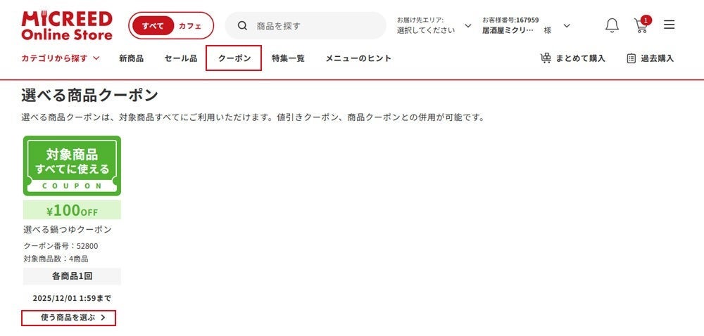 ※選べる商品クーポンの場合は、対象商品をお選びいただく必要があります。詳しくは以下の「選べる商品クーポンの利用方法」をご確認ください。
