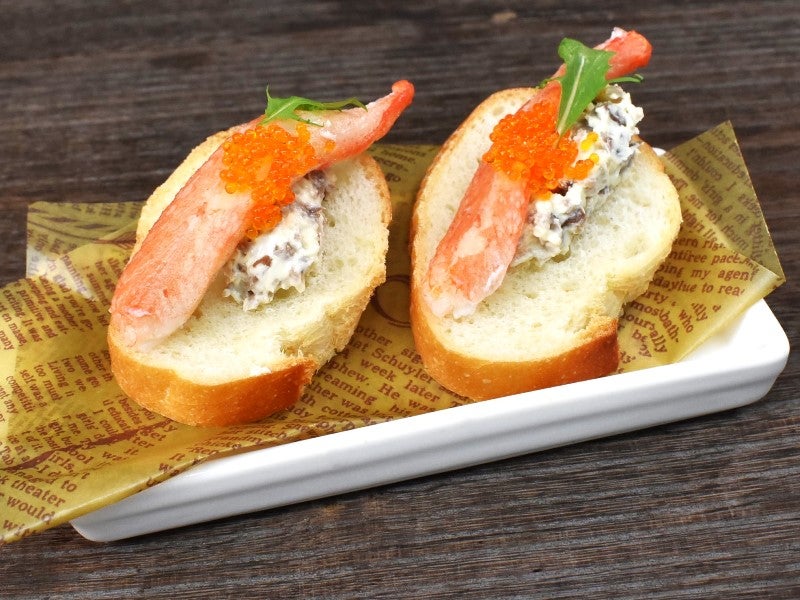 いぶりがっこととびっこの食感にかにの風味が合わさり、白ワインに合います。