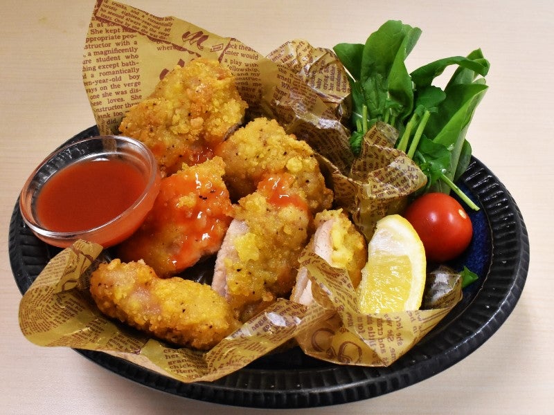 - 冷凍のまま「骨なしスライドチキン」を175℃の油で約5分揚げておく。