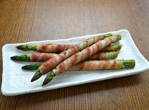 写真の見た目以上に大きくてインパクトがあると好評の、アスパラ1本丸ごと生ベーコンで巻いた商品です。