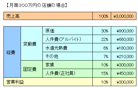 仮に、月商300万円の店舗で営業利益が10%だとすると、営業利益は30万円です。