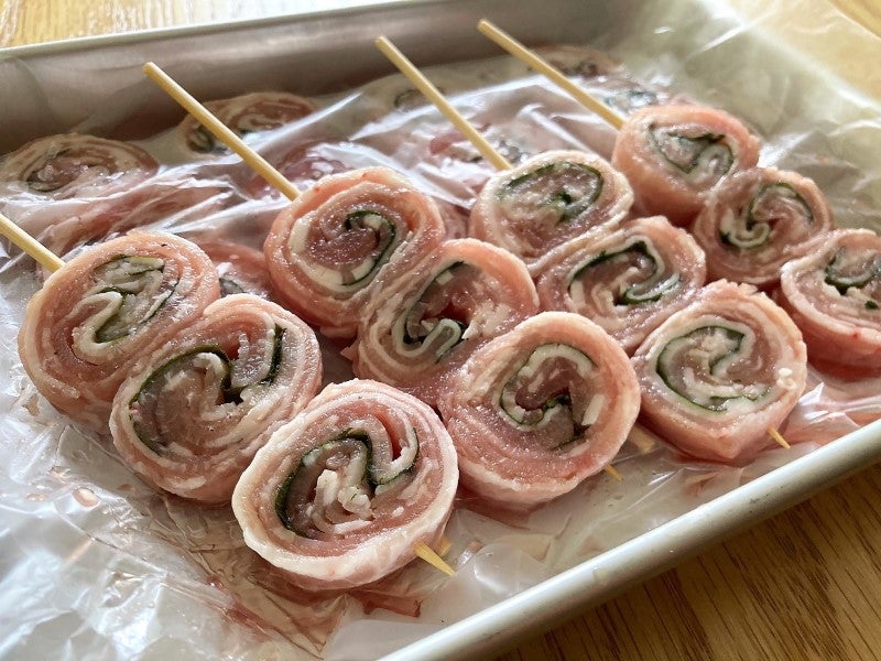 準備万端、仕込み済み。もちとチーズの肉巻き串です。