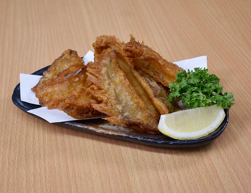 中骨を取って開いたソウハチカレイに、柚子香る明太バラ子をサンドしました。オーブントースターやフライパンでエイひれのようにしっかり炙って、お酒のつまみに最適です。又、水気を取って天ぷらや唐揚げでもフワフワ、サクサクの身が楽しめます。