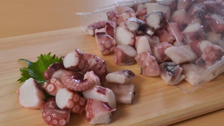 業務用食材の「タコ」は、刺身用の水だこ、スライス済みの寿司だこ、カット済みのたこぶつなど。