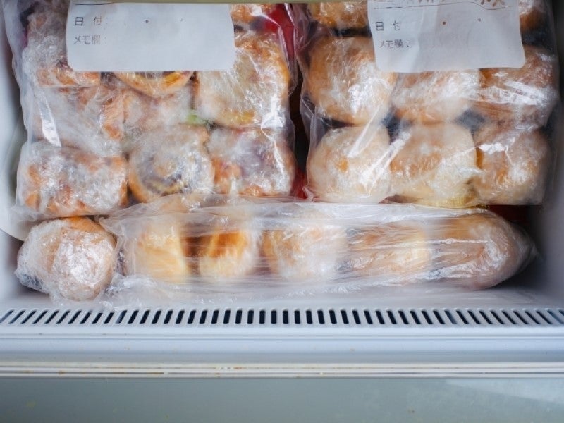 業務用の冷凍パンは、焼きたてパンを工場で急速凍結して、おいしさや水分を閉じ込めた商品ではありますが、冷凍庫内は乾燥しているので少しずつ老化は進んでしまいます。開け閉めの多い冷凍庫では温度変化で霜が付いたり、他の食品のにおいが移ったりもします。密封の袋や容器で保存し、できるだけ早めに使用してください。