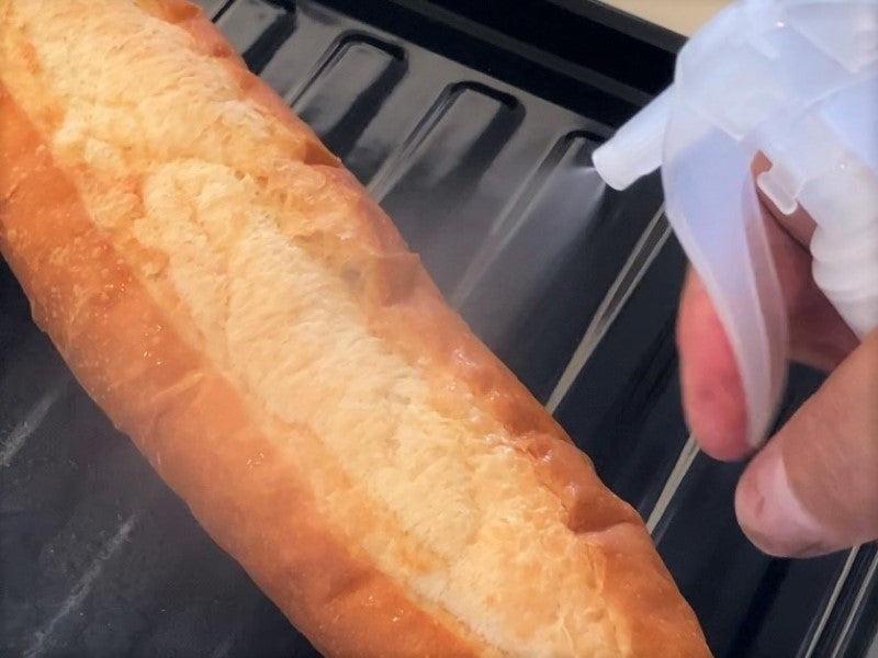 バゲットは霧吹きで皮に水を吹きかけてからリベイクします。