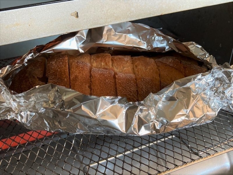 スライス済みのパンも、同様に霧吹きしてからリベイクします。スライス面からは水分が逃げやすいので、アルミを軽くかぶせてリベイクします。