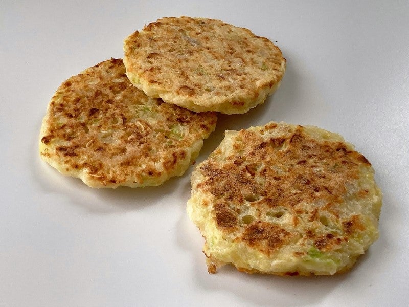 直径約8cm。山芋と卵白の生地にキャベツ・刻みイカを加えた山芋焼き。トロッとやわらかながら、箸で口に運べる程度の固さです。