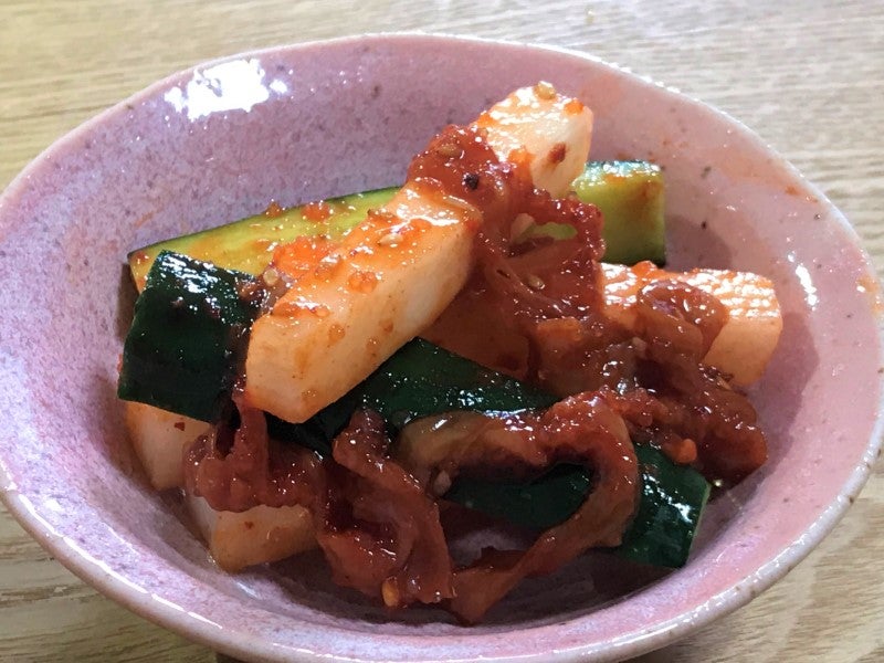 ヤンニョン(薬念)の中に、刻み込まれた素材の粗粒を舌に感じます。噛みしめると次第にじんわりとしっかりと辛味が広がってきます。