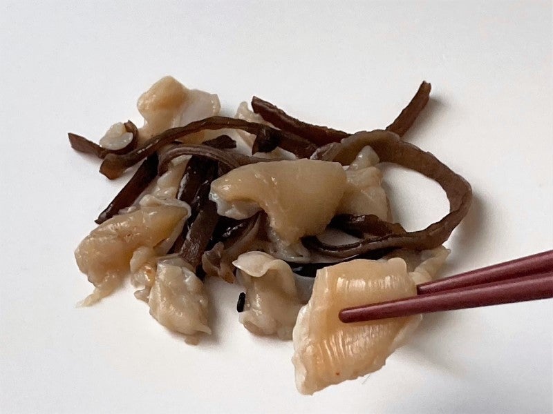 薄め細めに刻まれていて調味薬味によくなじみ、コリッとした強くしなやかな歯ごたえと繊維感を楽しめます。