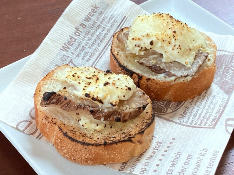バゲットにいぶりがっことクリームチーズを重ねるところまでは一般的。粉チーズを振ってバーナーで炙るところがポイント!香りが立ってチーズがなめらかになります。
