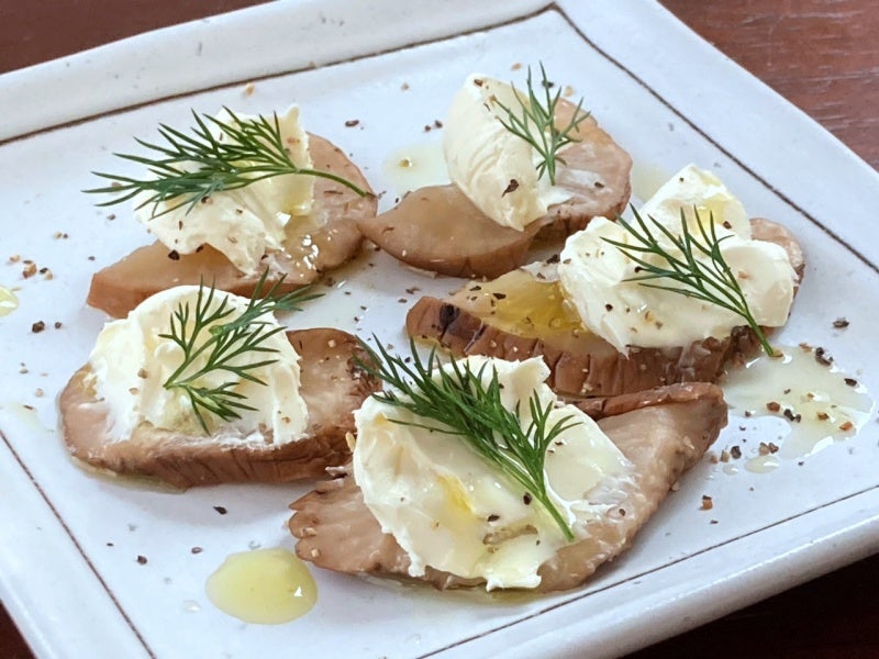 1枚ごとにクリームチーズを乗せ、香草や胡椒、オリーブオイルで洋風に仕立てたもの。
