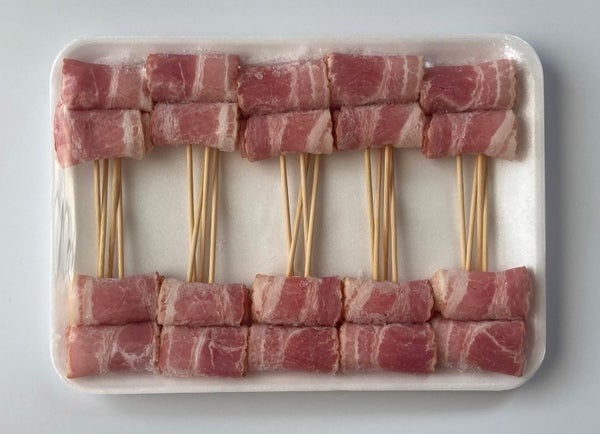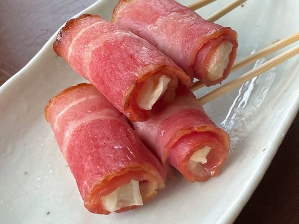 カマンベールチーズをベーコンで2周りほど巻いています。1本約30g、短い12cm串を2本打ちしています。