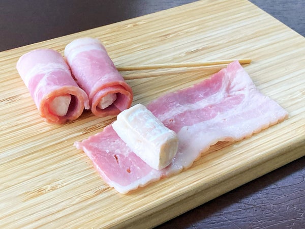 カマンベールにベーコンを巻きました。チーズ好きにもワイン好きにもお勧めの一品。