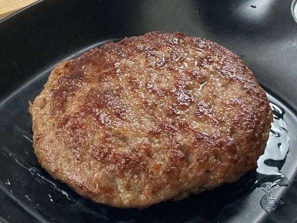 肉が締まって、元の形より丸くなります。(成型せずフライパンで表面を焼いた後オーブンで約10分加熱した例)