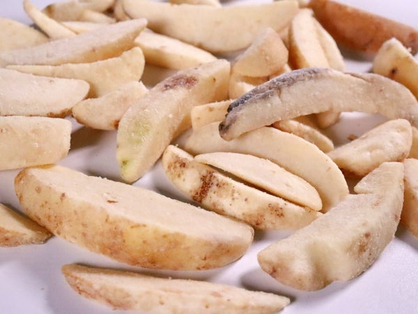 アメリカ産の大きなじゃがいもを使用。いもの形や大きさ、カットの方向によって、フライドポテトの大きさはけっこうばらつきがある商品です。