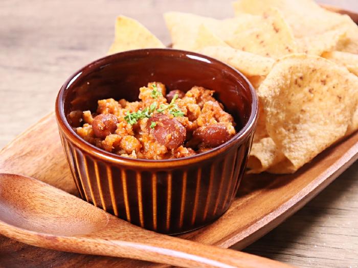 豆たっぷり!汁気は少なくひき肉の食べ応えあるチリコンカルネです。