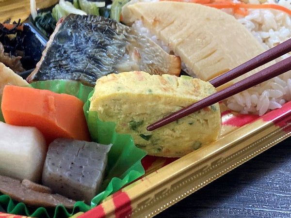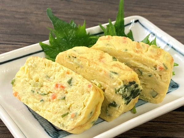 ねぎやかつお節の風味が効いた、京風だし味のやわらかたまご焼き。卵の黄色・にんじんの赤・ねぎの緑がメニューに彩りを添えます。