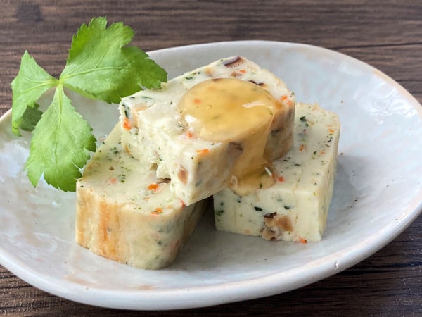 にんじん・ほうれんそう・しいたけを刻みいれ、卵白で寄せた白くて甘いたまご焼き。
