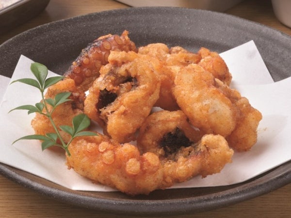 たこの足部分を中心にぶつ切りし、お酒に合うしっかり味の唐揚げ粉をまぶしました。