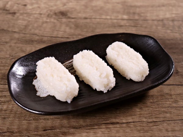 レンジして少し置き、ネタをのせたら寿司が提供できる、酢飯のシャリ玉です。