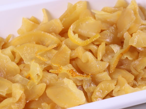 だいこん(国産)、ゆず皮(国産)、漬け原材料(果糖ぶどう糖液糖、食塩、醸造酢)、調味料(アミノ酸等)、酸味料、V.B1、甘味料(ステビア)、着色料(ウコン)、香料