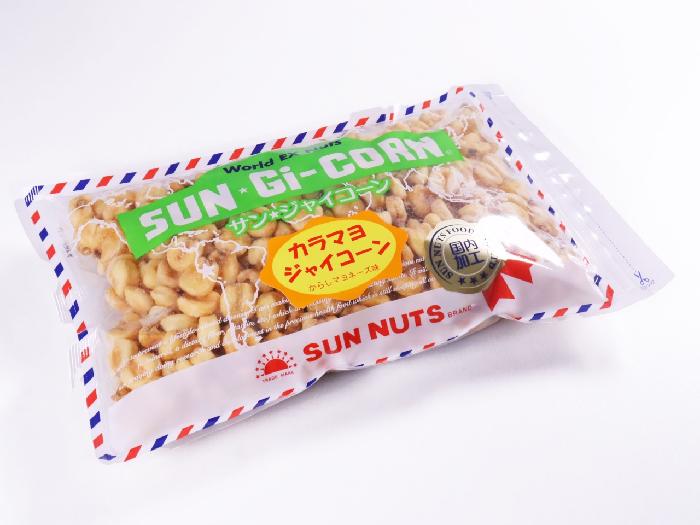 ジャイアントコーン(ペルー)、植物油、食塩、ぶどう糖、マヨネーズ風味調味料、粉末植物油脂、粉末醸造酢、マスタード、酵母エキスパウダー、オニオンパウダー/調味料(アミノ酸等)、香辛料抽出物、酸味料、リン酸Ca、香料、カロチノイド色素、(一部に卵、乳成分、小麦を含む)