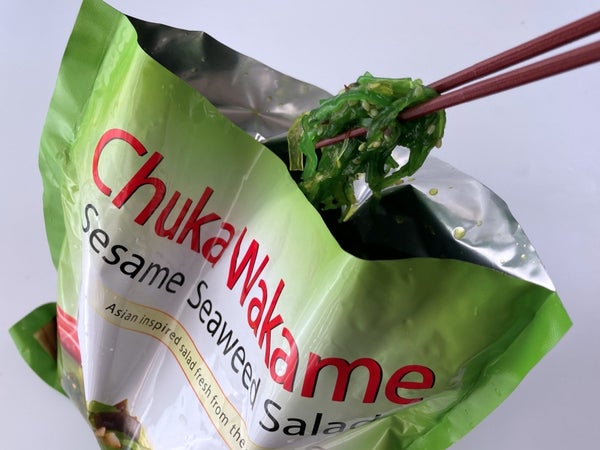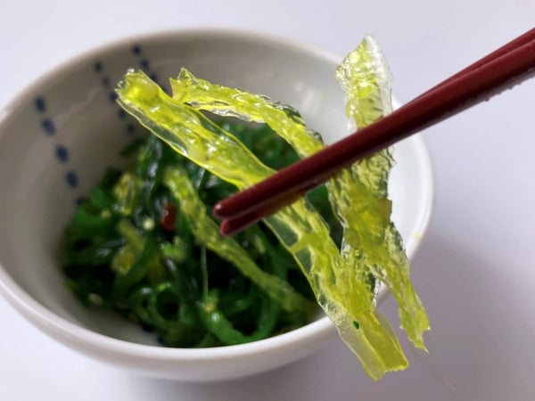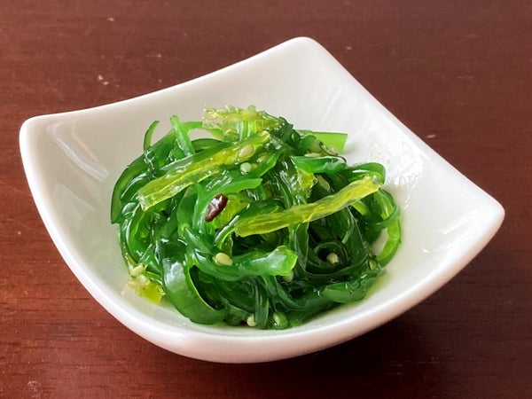細切りにした茎わかめと糸寒天を、ごま油・醤油・酢などで和えました。30gでこれくらいの量。
