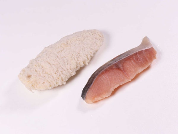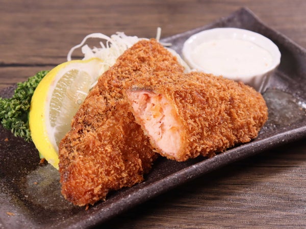 秋鮭(北海道)、衣(パン粉、ミックス粉(小麦粉、植物性たん白、食塩、ぶどう糖)、打ち粉(でん粉、小麦粉))、ベーキングパウダー、増粘剤(グァーガム)、着色料(カロチノイド)、(一部に小麦・さけ・大豆を含む)