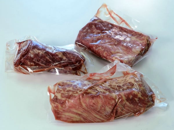 綺麗にサシが入っているものサシの入ってない真っ赤っ赤の赤身など商品の品質に非常にばらつきがある。 サシが入っている場合はラッキーだと思っている。お客さんにもそう伝えている。