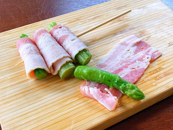 太アスパラを、約2mm厚のベーコンで1周半ほど巻き上げています。