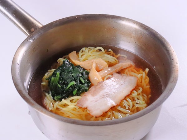スープをお湯で溶き、麺を入れてレンジで加熱すれば完成です。