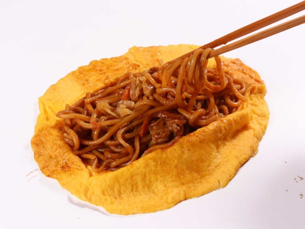 めん(小麦粉、食塩、粉末状植物性たん白、粉末卵白)、全卵(国内製造)、濃厚ソース、野菜(キャベツ、にんじん)、卵白、植物油脂、豚肉、還元水あめ、でん粉、食塩、脱脂粉乳/トレハロース、増粘剤(加工でん粉、増粘多糖類)、着色料(カラメル、カロチノイド)、かんすい、調味料(アミノ酸等)、乳化剤、pH調整剤、(一部に小麦・卵・乳成分・大豆・鶏肉・豚肉・もも・りんごを含む)