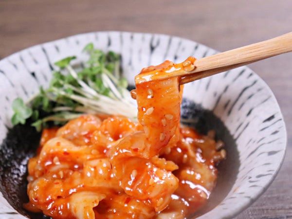 キムチのような辛酸っぱさではなく、コクのある甘辛な味付けです。ユッケのように卵黄がよく合います。