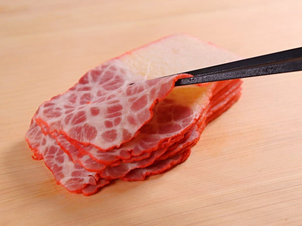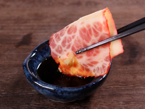 脂身(畝=うね)と肉部(須=す)が二層に重なった部位がくじらの腹側にあり、畝須(うねす)と呼ばれます。白と赤のコントラストが美しい部位です。これをベーコンにしたものが昭和時代のオヤジたちの日常的なつまみでした。いいうまみを出すので、そのまま食べる以外に、おでんや鍋に入れたり、刻んで汁物やチャーハンにされるなど、豚のベーコンより活用頻度が高かった食材でもあります。いまや多くの世代の人が知らない「くじらのおいしさ」をぜひご提供ください。