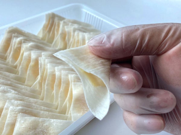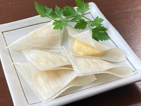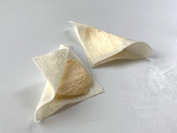 魚肉シートとチーズを組み合わせた定番おつまみです。乾きもの売り場に多い「サンド型の細切り」ではなく、ワンタン状にやさしく包んであります。三角の形は盛り付けでボリューム感も出せます。