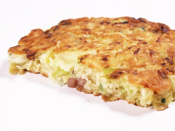 たっぷりのキャベツ、刻んだイカ・タコ・豚肉を入れて焼いたお好み焼きです。だしのきいたベーシックな生地で、ソースなどをかければかんたんに提供できます。シンプルな味なので、ソースやタレでアレンジしたり、ネギやすじこんなどを上に重ねた創作お好み焼きのベースにもご使用ください。
