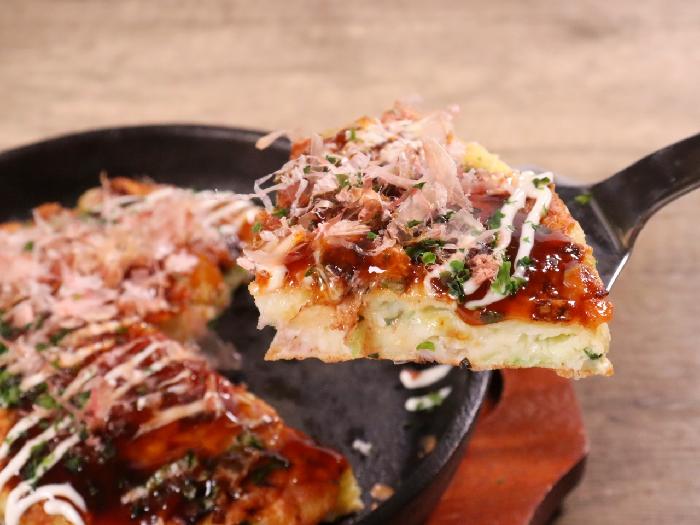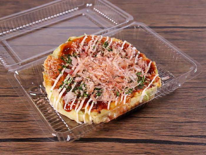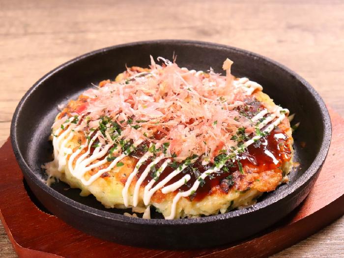 たっぷりのキャベツとイカ・タコ・豚肉入り。だしのきいた生地のベーシックなお好み焼きで、トッピングアレンジ自在です。