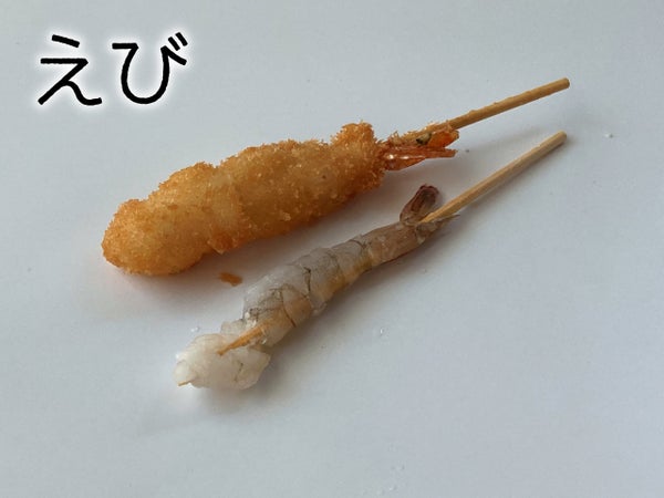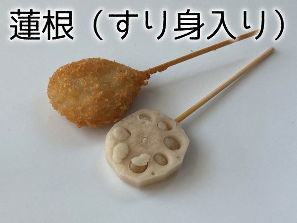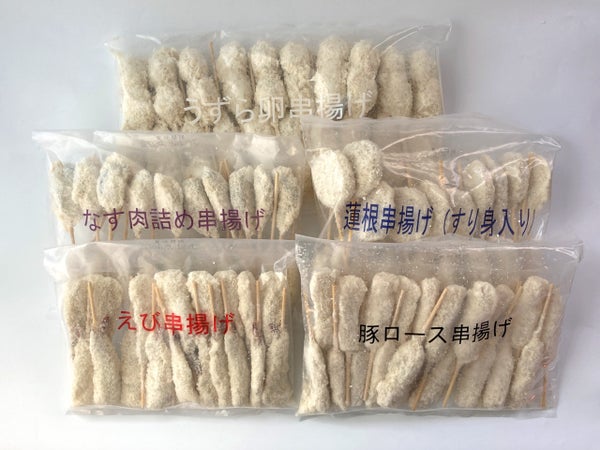 冷凍のまま、170~180℃の油で、うずら約5分、蓮根すり身・なす肉詰め4分半~5分、豚ロース・えび約3分揚げてください。