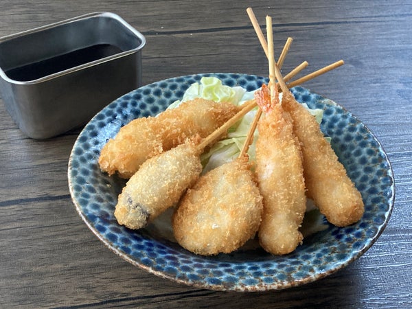 肉・魚介類・野菜と、バラエティー豊かな5種盛りの串揚げを提供できます。