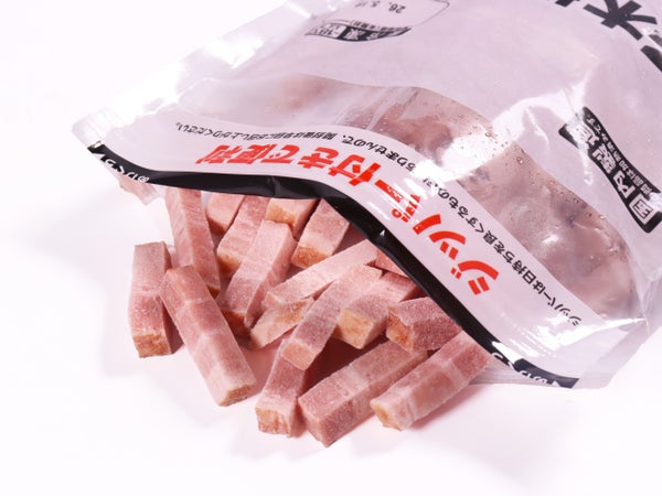 豚ばら肉(輸入又は国産(5%未満))、糖類(砂糖、水あめ)、植物性たん白、食塩、卵たん白、乳たん白/調味料(有機酸等)、加工でん粉、カゼインNa、リン酸塩(Na)、くん液、酸化防止剤(ビタミンC)、増粘多糖類、発色剤(亜硝酸Na)、クチナシ色素、香辛料抽出物、(一部に卵・乳成分・大豆・豚肉を含む)