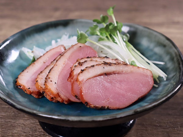 飼料に紅茶葉を加えることで肉色と香りをよくした「紅茶鴨」を使用しました。胡椒をまぶしたパストラミタイプ。