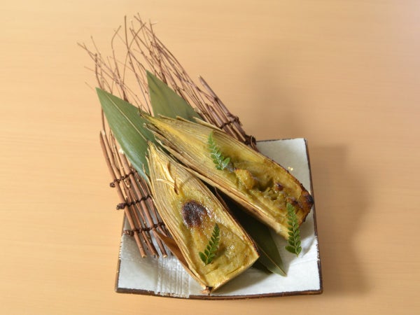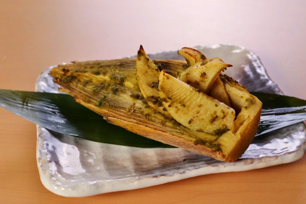 皮付きの孟宗竹を半割りにして、可食部分にカットを入れました。焼き物におすすめの見栄えが良い一品です。
