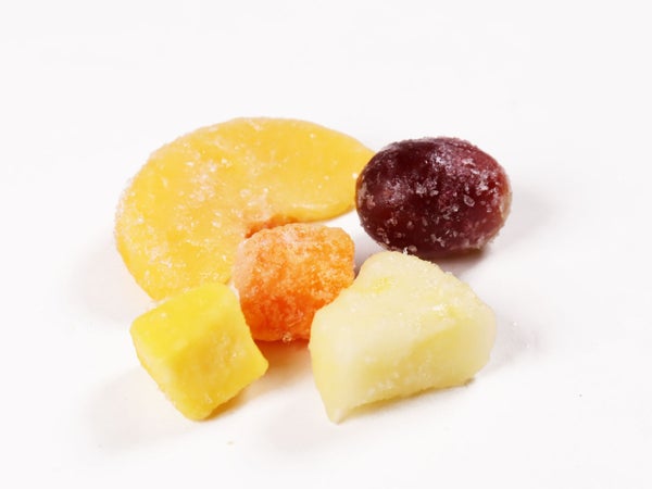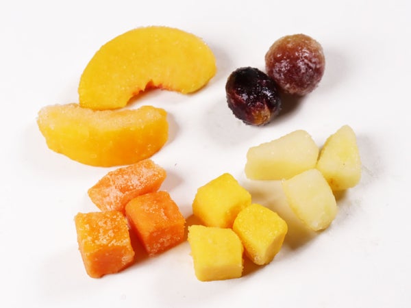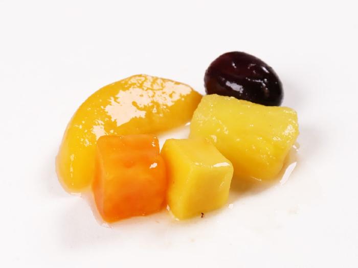 桃、パイナップル、マンゴー、パパイヤ、ぶどうの5種。(ぶどうの配合量は少なめです)