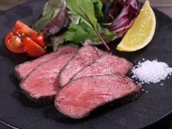 国産牛もも肉のブロックに塩こしょうをすり込み、真空低温調理でやわらかく仕上げました。