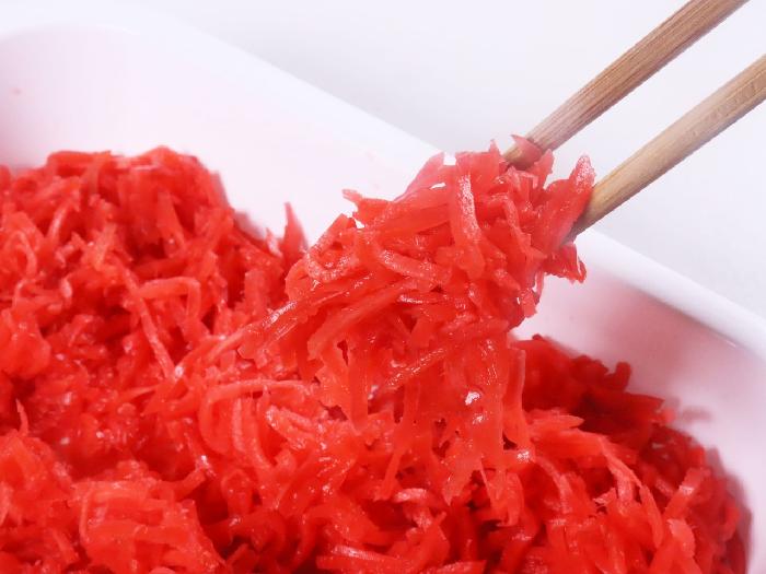 牛丼・やきそば・焼きうどんなどのトッピングには欠かせない、紅生姜の千切りです。