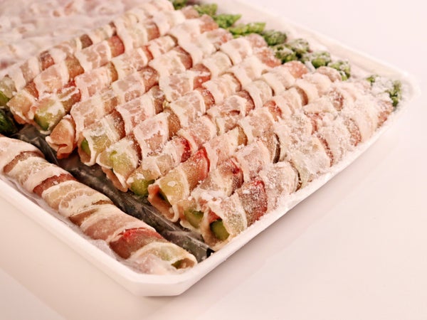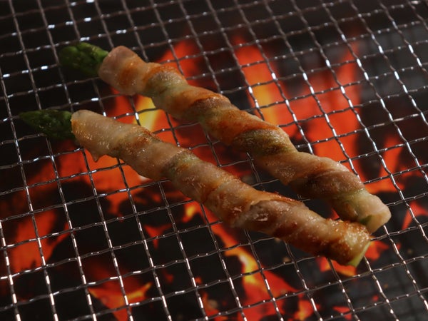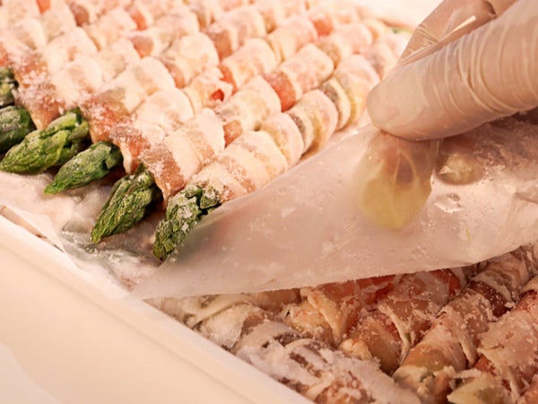 太めのアスパラガスを長いまま、生ベーコンで巻きました。加熱ベーコンのようなチープさがなく、肉のうまみと塩気が、アスパラガスによく合う最高の組み合わせです。生のアスパラにはかなわないものの、十分に食感やおいしさが感じられます。