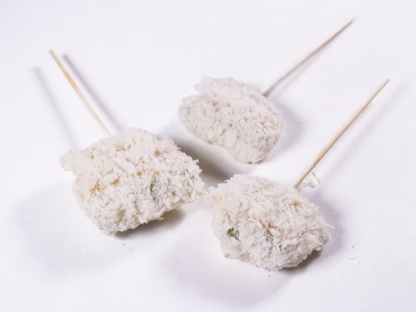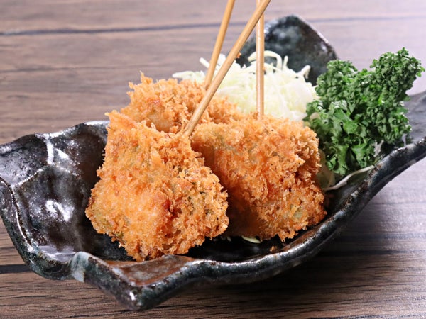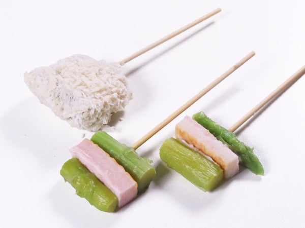 国内工場でカットアスパラとブロックベーコンを串に刺し、丁寧に衣付けしました。