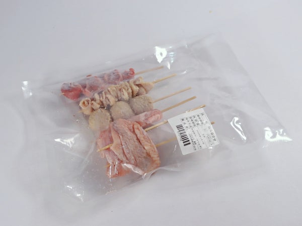 鶏モモ(国産)、鶏手羽先(国産)、鶏皮(国産)、鶏砂肝(国産)、つくね【鶏肉、(パン粉、豚脂、粉末状植物性たん白)、玉ねぎ、粒状植物性たん白、食塩、砂糖、乳清たん白、香辛料、加工デンプン、調味料(アミノ酸等)、増粘多糖類、リン酸塩(Na)、(原材料の一部に小麦、乳、鶏・豚を含む)】